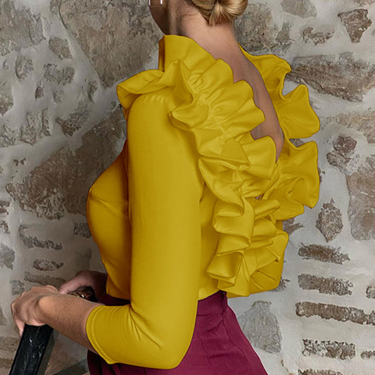 • Solid Color Sexy Niche Design Lotus Collar Top