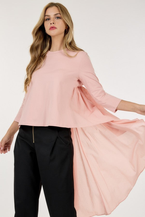 CONTRAST RUFFLE QUARTER SLEEVE HIGH LOW TOP