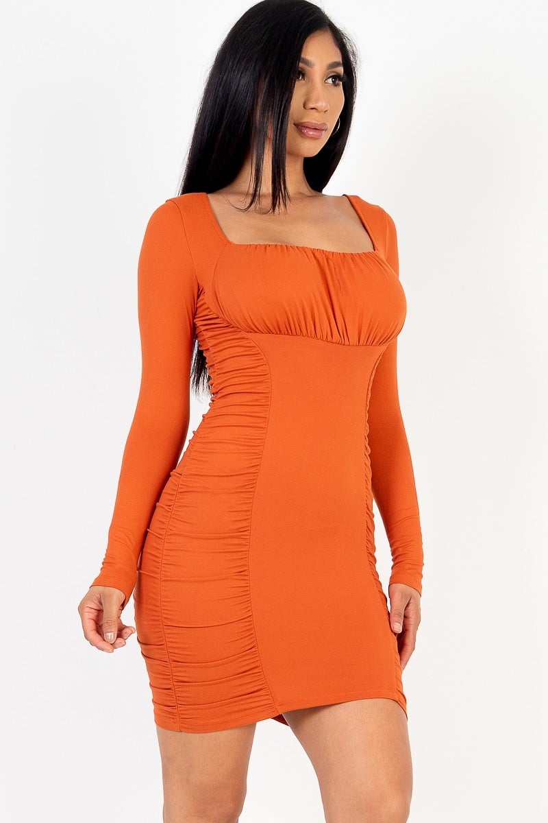 U-neck long sleeve ruched bodycon mini dress