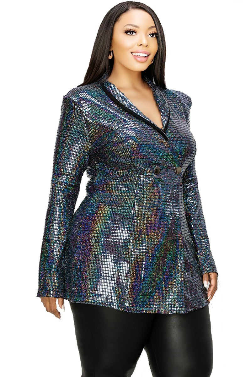 Plus Disco Metallic Sequins Double Breasted Blazer