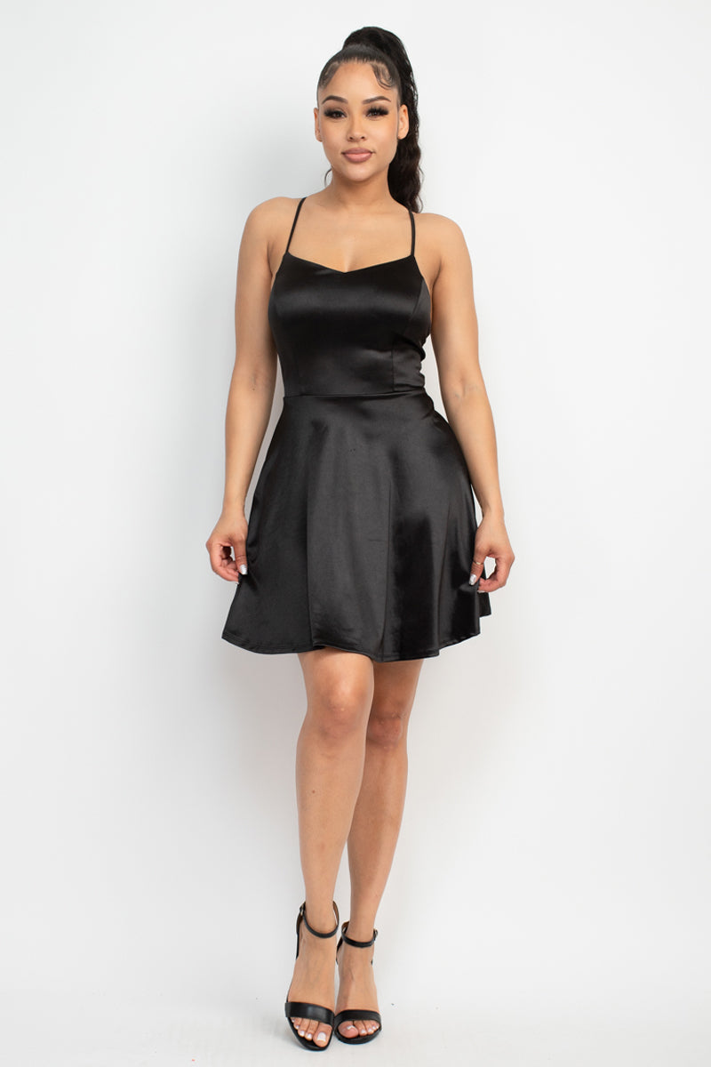 A satin skater dress in solid color featuring a V-neckline, sleeveless, back crisscross design, A-line silhouette, cinched waistline, and a mini length.