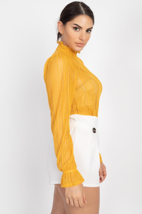 A knit lace top featuring a mock neckline with ruffle trim, shirred shoulders, long sleeves with bell cuffs, and a waist length