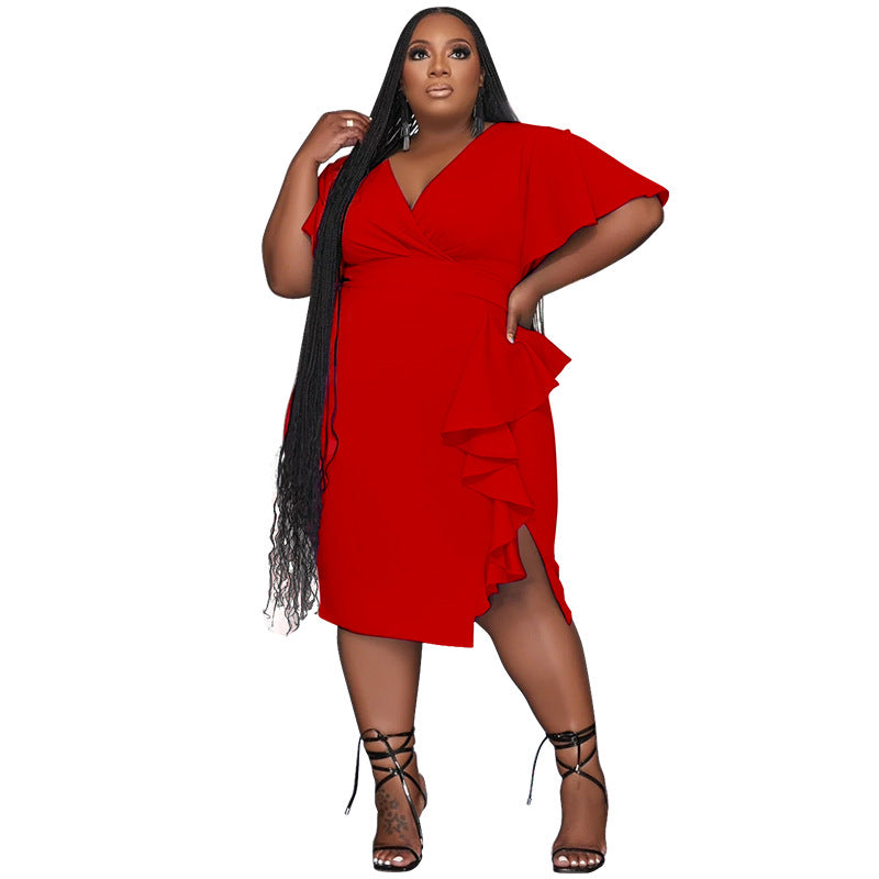 Plus Size Elegant Women Clothing Solid Color V neck Ruffled Slim Fit Sexy Dress