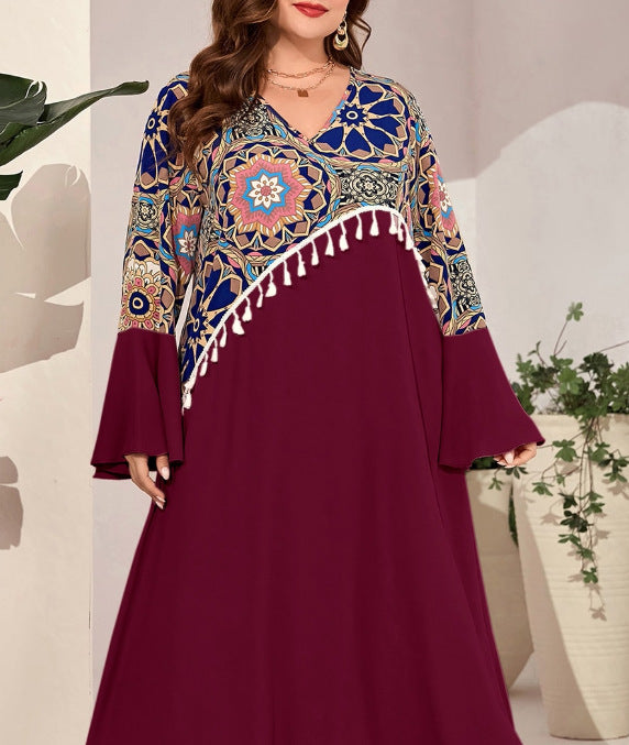 Plus Size Tassel Printed Pullover Office Maxi Dress Women