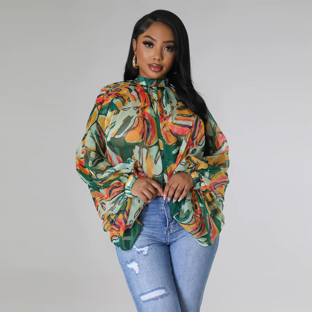 Women Lace Printing Chiffon Shirt Batwing Sleeve Top